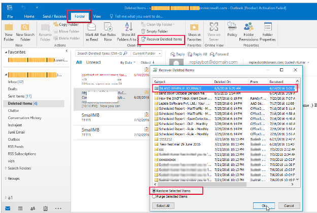 To recover permanently deleted items, click Recover Deleted Items (in the Folder ribbon) in Outlook. A new window with the list of all the recoverable items appears. Select the required items and click Restore Selected Items. When recovered, the items go back to their original location.